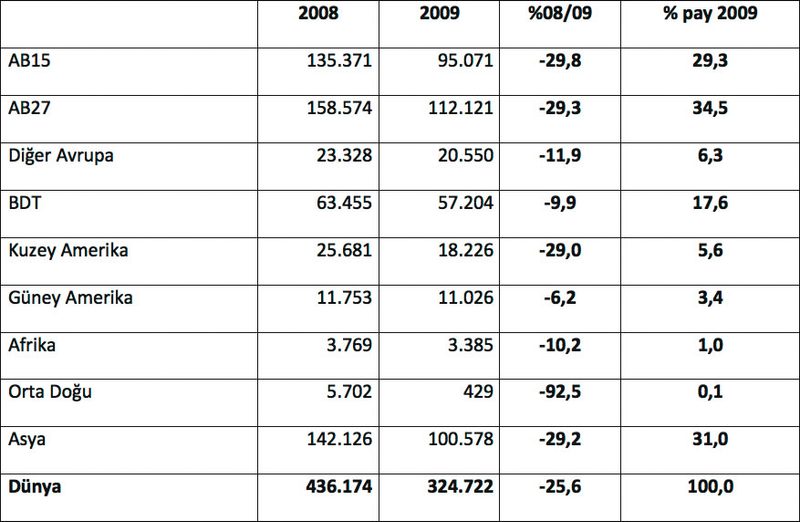 Dünya Çelik Derneği (WSA) verilerine göre, 2009 yılında, dünya çelik ihracatı, 25.6 oranında düşüşle, 436 milyon tondan, 325 milyon tona geriledi. 2009 yılında bütün bölgelerin çelik ihracatında düşüş yaşandı. Dünya çelik ihracatının 31’ini gerçekleştiren AB-27’nin ihracatı, 34.5 oranında düşüşle, 159 milyont ondan, 112 milyon tona gerilerken, Asya’nın toplam ihracatı, 29.2 oranında düşüşle, 142 milyon tondan, 101 milyon tona geriledi. AB ve Asya’nın ardından en fazla çelik ihracatı yapan bölge olan BDT’nin ihracatındaki düşüş 9.9 seviyesinde kalırken, Türkiye’nin de içerisinde yer aldığı Diğer Avrupa bölgesindeki ihracat düşüşü ise, 11.9 seviyesinde gerçekleşti.