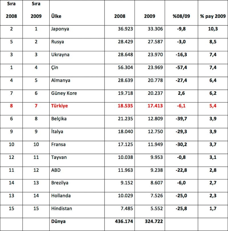 2008 yılında 18.5 milyon tonluk ihracatı ile sekizinci sırada yer alan Türkiye ise, 2009 yılında 6.1 oranında düşüşle, 17.4 milyon tonluk ihracatı ile, bir basamak yükselerek, yedinci sırada yer aldı.