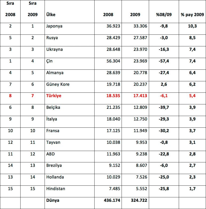 2008 yılında 18.5 milyon tonluk ihracatı ile sekizinci sırada yer alan Türkiye ise, 2009 yılında 6.1 oranında düşüşle, 17.4 milyon tonluk ihracatı ile, bir basamak yükselerek, yedinci sırada yer aldı.