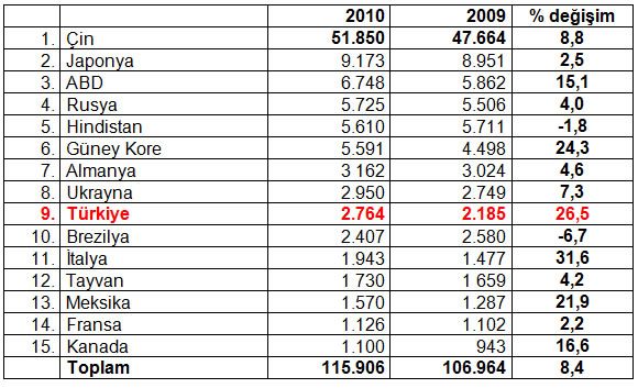 Aralık ayındaki üretimi ile, dünyanın en fazla ham çelik üreten ülkeleri sıralamasında 9’uncu sırada bulunan Türkiye, 2010 yılının tamamında, 10’uncu sıradaki yerini korudu.