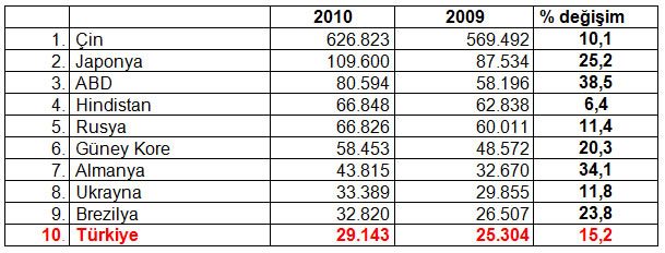 Aralık ayında, üretimini yüzde 26.5 oranında artışla, 2009 yılının aynı ayındaki 2.18 milyon ton seviyesinden 2.76 milyon ton seviyesine yükselten Türkiye, 2010 yılının tamamında yüzde 15.2 oranında artışla, 29.1 milyon ton ham çelik üretimi gerçekleştirdi.