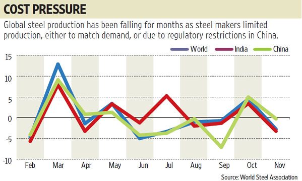 Hindistan’ın çelik üretimi yüzde 3.2 geriledi. Bir sebep Ispat Sanayi şirketinin Kasım ayından beri kapalı olması olabilir. Fabrika yakın zamanda yeniden üretime başladı. Bir diğer neden de yüksek demir cevheri fiyatları ve düşük değişim marjinleri olabilir; Motilal Oswal Menkul Araştırma raporuna göre, bu durum küçük çelik şirketlerinin çelik yerine sünger demir satmalarına neden olmuş olabilir.