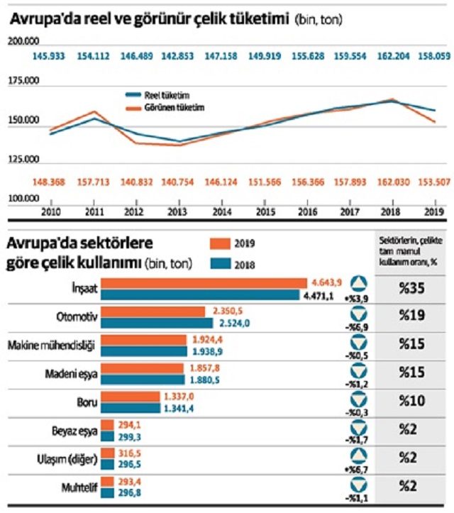 EUROFER’in son Ekonomi ve Piyasa Görünümü raporuna göre, AB’nin 2020 yılının ilk çeyreğindeki görünür çelik tüketimi 2019’un son çeyreğinde kaydedilen yüzde 10.8’lik düşüşün ardından yıllık yüzde 12 gerileyerek 37.6 milyon ton oldu. Çelik talebinde art arda 5 çeyrek dönemdir gerileme yaşanıyor. Çelik kullanan sektörlerin toplam üretimi geçen yılın son çeyreğinde kaydedilen yüzde 1.3’lük düşüşün ardından bu senenin ilk üç ayında da yüzde 7.2 gerileme gösterdi.