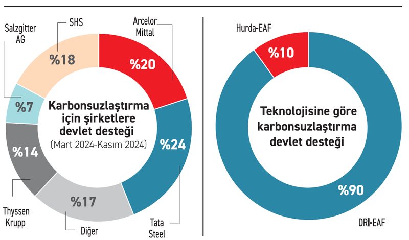 Hollanda Parlamentosu, Tata Steel’in Ijmuiden tesisine 3 milyar euro çevre sübvansiyonu sağladı. İtalya’da ise Acciaierie d’Italia’nın doğrudan indirgenmiş demir (DRI) tesisi inşası için 1 milyar euro ayrıldı. Tata Steel, İngiltere ve Hollanda’daki projeleriyle en fazla devlet desteği alan şirket olarak öne çıkıyor.