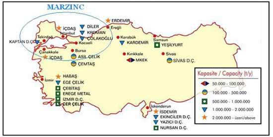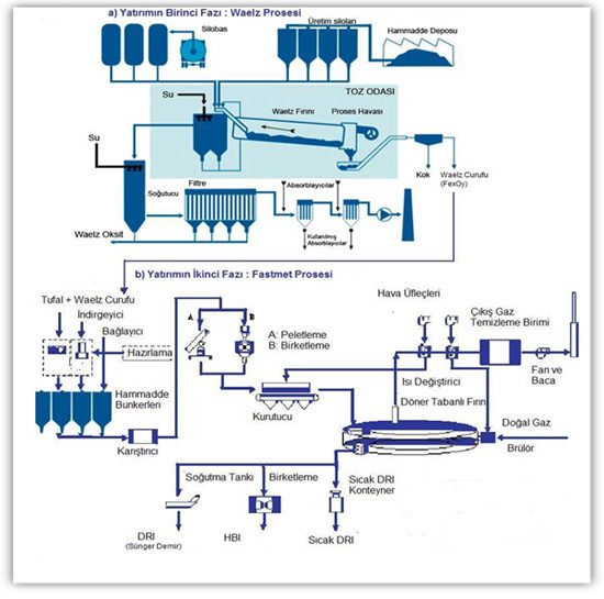 Marzinc Marmara Geri Kazanım Sanayi Tic. A.Ş.: baca tozundan çinko oksit konsantresi, baca tozunun işlendiği döner fırında meydana gelen demirli bakiye ile çelik üretim haddehanelerinde oluşan tufalden, sünger demir (DRI) kazanımını sağlayan iki kademeli teknolojiye sahip modern bir geri kazanım tesisi kurma çalışmalarını halen sürdürmektedir (Şekil 2). Yapılan fizibilite çalışmasına göre, yatırım tutarının 120 milyon $ olması beklenen bu projenin öncelikli amacı: en son teknolojiye dayanan çevre dostu prosesler kullanılarak demir-çelik üretim atıklarının geri kazanımının sağlanmasıdır.