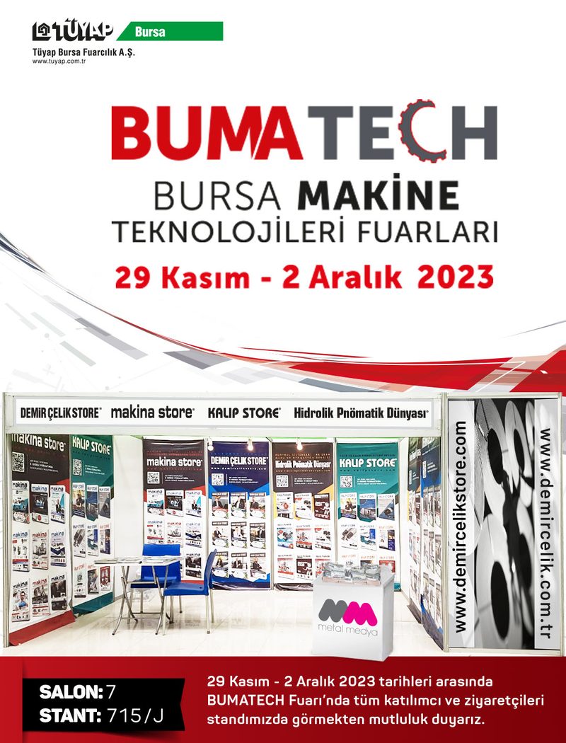 Tüyap Bursa Uluslararası Fuar ve Kongre Merkezi’nde düzenlenecek olan BUMATECH, uluslararası nitelikteki 21. Bursa Metal İşleme Teknolojileri 14. Saç İşleme Teknolojileri ve 20. Otomasyon Fuarlarını tek çatı altında buluşturacak. Oluşturduğu ticaret hacmi ile bölgenin en önemli fuarı haline gelen BUMATECH Bursa Makine Teknolojileri Fuarına Metal Medya Grubu olarak; Demir Çelik Store, Makina Store, Kalıp Store Ve Hidrolik Pnömatik Dünyası dergilerimiz ile fuarda yer alacağız. Fuarda sektörün nabzını takip ederek ve makine sektöründeki son teknolojik gelişmeleri okuyucularımızla paylaşacağız. Salon 7, 715/J’deki standımıza tüm ziyaretçileri ve dostlarımızı bekleriz.