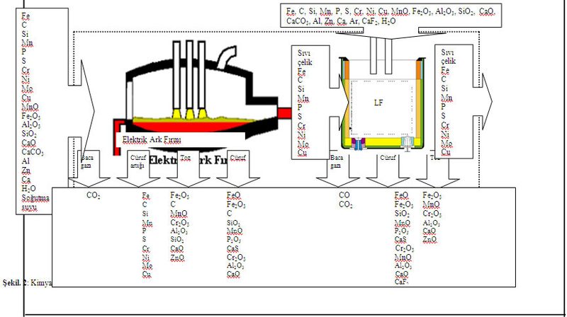 EAF ve LF üretim sistemleri şematik olarak Şekil 1’de tek bir sistem olarak gösterilmiştir. EAF ve LF sistemine giren maddelerin kimyasal yapıları ile birlikte kompozisyonları Çamdalı [1] ve Çamdalı ve Tunç[5] referanslarından alınmıştır.