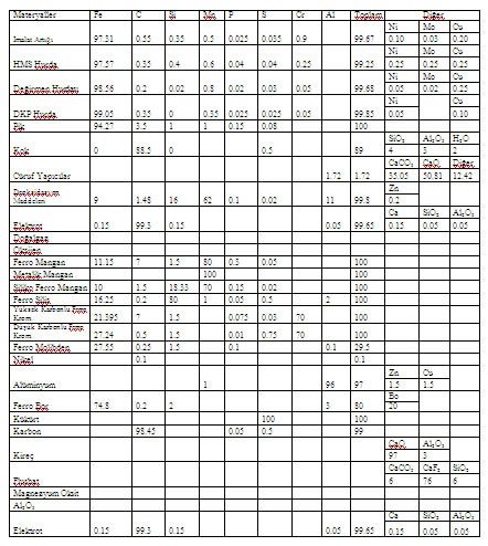 EAF ve LF’den çıkan maddelerin Kimyasal analizleri [2,5,6,7] referanslarından alınmıştır. Çıkan maddeler 100 kg başına giren her bir madde için düzenlenmiştir. Çıkan her bir maddenin kimyasal analizleri Tablo 2’de verilmiştir.