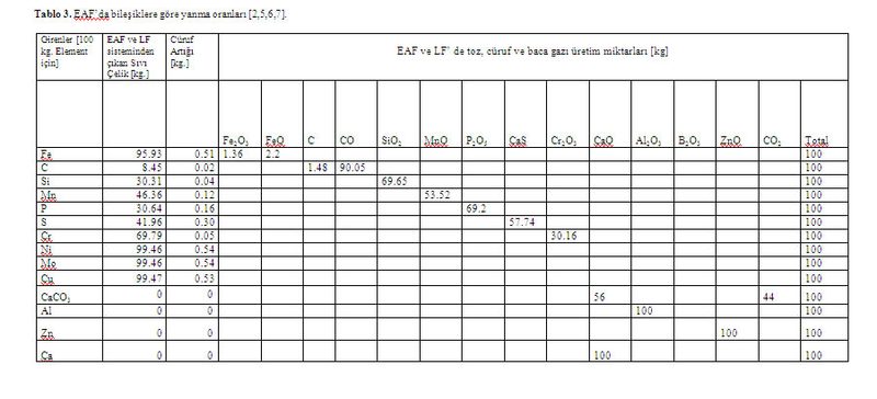 Daha önceki çalışmalarda EAF ve LF fırınları ayrı ayrı modellenmiş ve incelenmiştir. Ancak bu çalışmada her iki fırında tek bir sistem olarak ele alınmış ve daha sonra sisteme giren ve çıkan maddeler kimyasal analizlerden ve reaksiyonlardan yararlanılarak elde edilmiştir. Sistemde meydana gelen bazı kimyasal reaksiyonlar Tablo 1’de verilmiştir. Tablo 1’den de yararlanılarak Tablo 2 düzenlenmiştir.