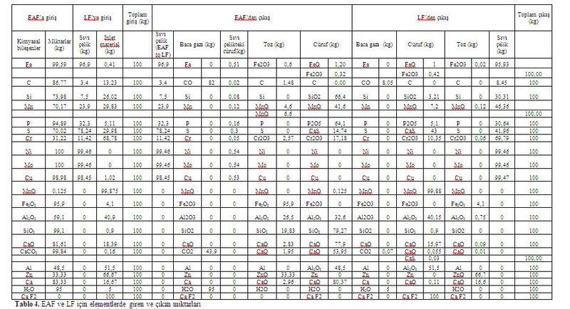 Bu çalışmada sisteme (EAF+LF) giren her bir 100 kg madde için çıkan maddelerin miktarları ve kimyasal bileşimleri elde edilmiştir. Dolayısıyla burada bu analizde EAF ve LF tek bir sistem olarak değerlendirilmiştir. Elde edilen sonuçlar tablolar yardımıyla gösterilmiştir.