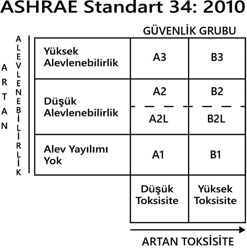 Yeni geliştirilen alternatif akışkanları (HFO) küresel ısınmaya etkisi düşük seviyede olmasına rağmen yanıcı ve toksik sınıflarının HFC grubuna göre yüksek olması kullanımlarının önünde engel teşkil etmektedir. Bu olumsuz özellikleri ortadan kaldırılması amacıyla HFO ile HFC grubuna ait akışkanların belirli oranlarda karışımı ile yeni soğutucu akışkanlar geliştirilmektedir. Bu yeni akışkan karışımları buhar sıkıştırmalı çevrimde kullanıma uygun olarak geliştirilmektedir. Böylelikle ASHREA tarafından tanımlanan ve Şekil-2’de görülen A3 ve A2 yanıcı sınıfına sahip akışkanlar, A2L ve A1 olarak sınıflandırılan güvenli sınıfa kaymaktadır.
