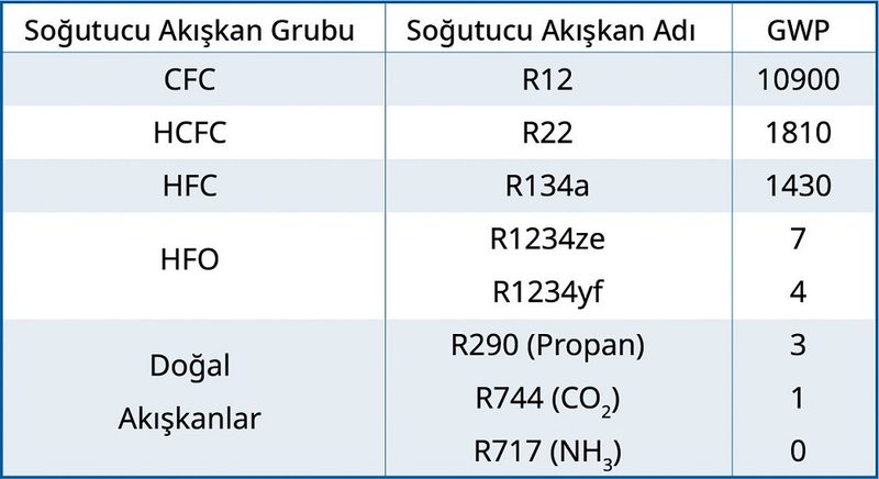Kigali değişikliği ile birlikte CFC ve HCFC’lerin ardından HFC’lerinde sınırlandırılmaya başlanmasıyla soğutucu akışkanlar alanında yeni alternatif akışkanlara ihtiyaç duyulmuştur. Yeni alternatif geliştirme çalışmaları iki kategoride devam etmektedir. İlk kategoride daha önceden de bilinen CO2 (R744), Propan (R290), amonyak (R717) gibi doğal akışkan alternatifleri çalışılmaktadır. İkinci kategoride ise yeni nesil çevreci soğutucu akışkanlar olarak adlandırılan Hidrofloroolefinler (HFO) grubunda soğutucu akışkanlar bulunur. Bunların en yaygın bilinenleri R1234yf ve R1234ze soğutucu akışkanlardır. Bu akışkanlar mevcut HFC grubuna dahil olan en çok kullanılan akışkanların başında gelen R134a’ya alternatif olarak geliştirilmiştir. [3] Alternatif olarak düşünülen bu akışkanların GWP değerleri, HFC grubu akışkanları ile kıyaslandığında çok düşüktür. Örnek üzerinden karşılaştırılmak istenirse Tablo-1 incelenebilir;