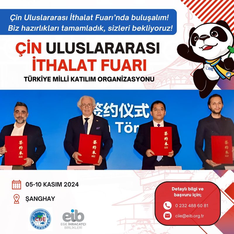 Çin ile dış ticaret açığımızın azaltılması; Türk ürünlerimizin Çin’de tanıtılması ve marka imajının güçlendirilmesi amacıyla 05-10 Kasım 2024 tarihlerinde Çin/Şanghay’da 7. kez düzenlenecek; dünyanın en büyük ithalat fuarı ve Çin’in en prestijli fuarı olan “CIIE - Çin Uluslararası İthalat Fuarı 2024” Türkiye Milli Katılım organizasyonu 5. kez Ege İhracatçı Birlikleri (EİB) organizatörlüğünde gerçekleştirilecek.