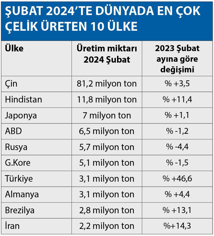 Öte yandan çelik sektörü üretimde de 2023’ün ocak-şubat ayına göre 2024 yılının ilk iki ayında % 34,5 artışla 6,4 milyon ton çelik üretimi gerçekleştirdi. Çelik sektörü, güçlü büyüme performansını sürdürdü. Böylece; Türkiye dünyanın en büyük 10 ham çelik üreticisi arasında, Almanya’yı geride bırakarak 7. sıraya ve Avrupa’nın en büyük çelik üreticisi konumuna yükseldi.