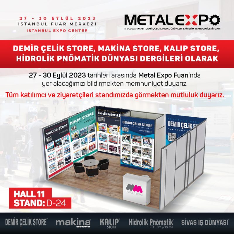 Metal Medya Grubu olarak bizde DEMİR ÇELİK STORE, MAKİNA STORE, KALIP STORE VE HİDROLİK PNÖMATİK DÜNYASI dergilerimizle Hall 11 Stand D24'de siz değerli okuyucularımızla buluşmaktan mutluluk duyarız.