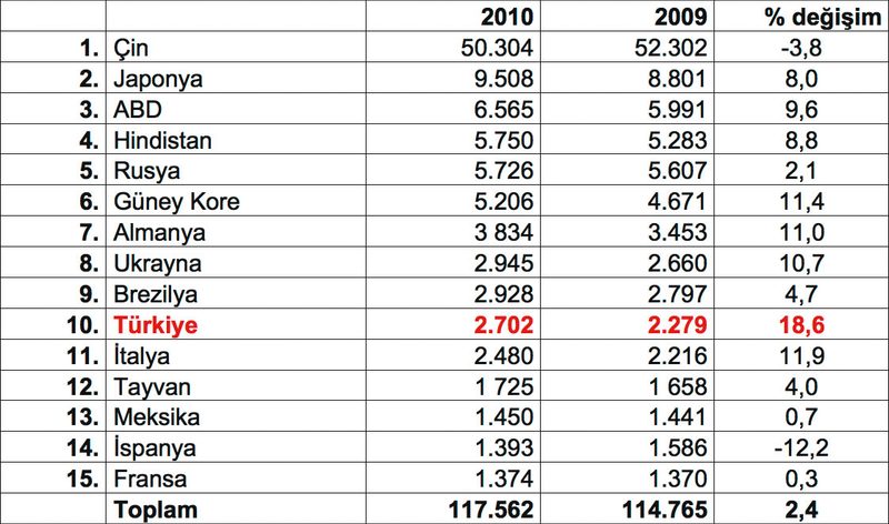 Ekim ayında, ham çelik üretimini yüzde 18.6 oranında artışla, 2.7 milyon tona yükselten Türkiye, Ocak-Ekim döneminde yüzde 12.6 oranında artışla, 23.6 milyon tonluk üretimi ile, dünyanın en büyük üreticileri sıralamasındaki 10. sıradaki yerini sağlamlaştırdı.