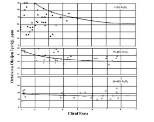 Malzeme bileşiminde bulunan kalıntıların cürufa geçmesinde oksijen etkili rol oynamakta, cüruftaki alümina miktarına bağlı olarak değişmektedir. Şekil.2 de alümina miktarının artmasıyla sıvı cüruf içindeki oksijen miktarı azalmaktadır [8].