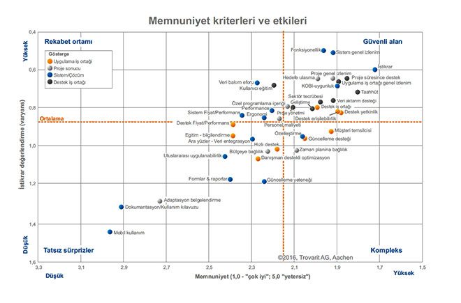 Sonuçlar değişik açılardan detaylı analiz edildiğinde farklı bir resim ortaya çıkmaktadır. X ekseni analizi yapılan 2,545 kurulumun ortalama memnuniyet derecelerini göstermektedir. Y ekseni ise memnuniyet kriterleri ve bu kriterlerin değerlendirmeler içindeki memnuniyet bakımından istikrarını ya da başka bir değişle önem derecesini, konumunu ve riskini ifade etmektedir.