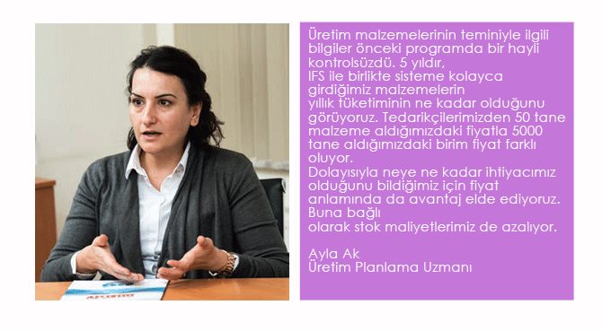 “İş süreçlerimizi IFS ERP’de tek bir sistem üzerinde toplamak; farklı süreçlerde planlama kabiliyetimizi artırdı ve maliyet avantajı sağladı. IFS’in bilgi birikimi, bu sürecin hızlı yönetilmesi ve doğru şekilde kurgulanması noktasında bize önderlik etti.”