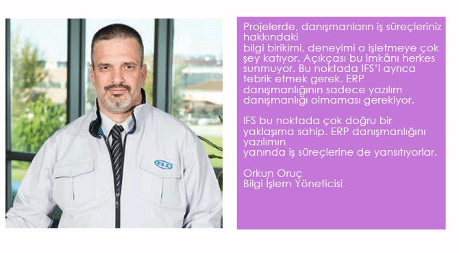 Orkun Oruç da “Projelerde, danışmanların iş süreçleriniz hakkındaki bilgi birikimi, deneyimi o işletmeye çok şey katıyor. Açıkçası bu imkânı herkes sunmuyor. Bu noktada IFS’i ayrıca tebrik etmek gerek. ERP danışmanlığının sadece yazılım danışmanlığı olmaması gerekiyor. IFS bu noktada çok doğru bir yaklaşıma sahip. ERP danışmanlığını yazılımın yanında iş süreçlerine de yansıtıyorlar” diye belirtiyor.