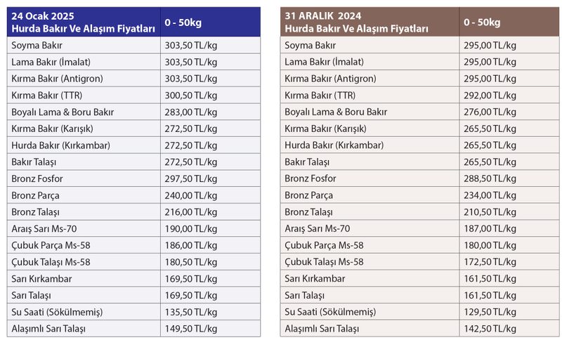 Hurda bakır ve alaşım fiyatları 2025 Ocak ayında yüzde 3 artarken hurda alüminyumda da yüzde 1 bir artış gözlemlendi.