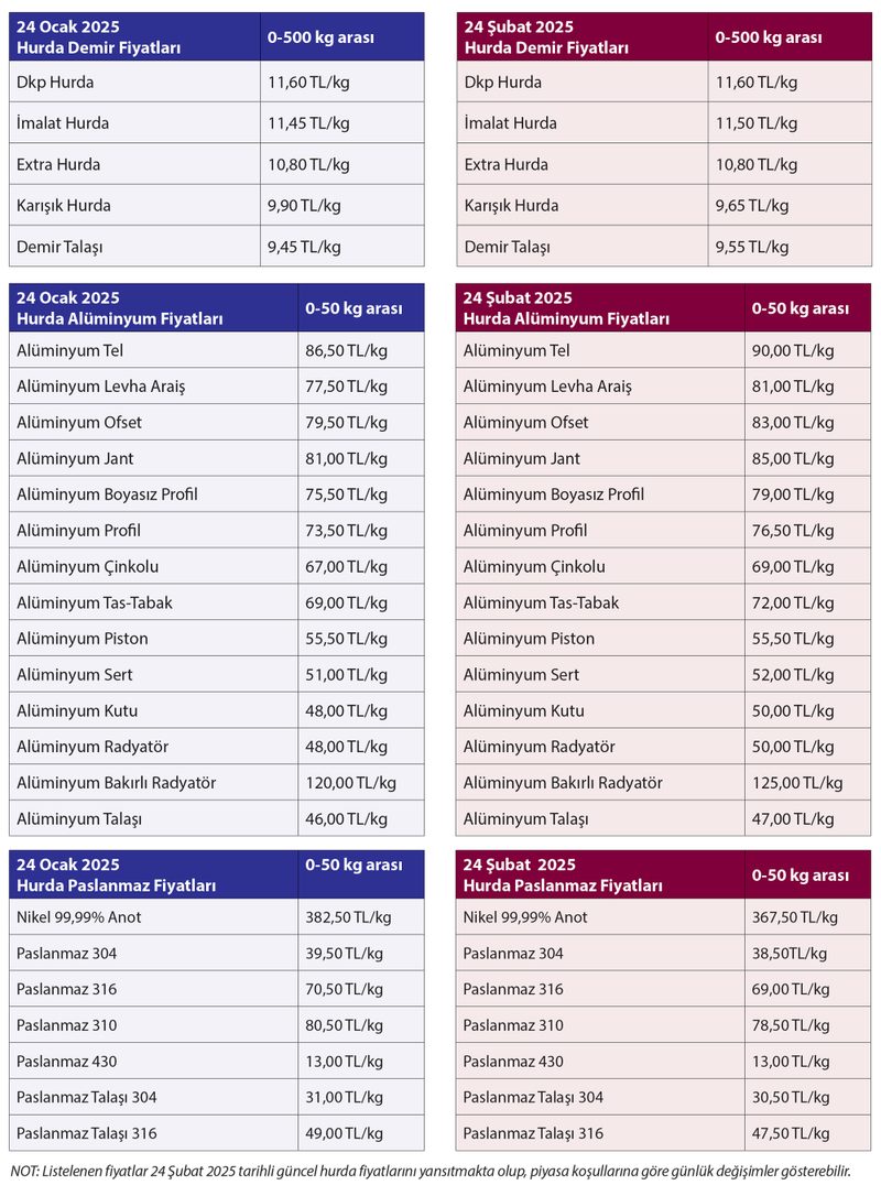 Hurda bakır ve alaşım fiyatları 2025 Ocak-şubat ayında yaklaşık yüzde 5 artarken hurda alüminyumda da yüzde 4 bir artış gözlemlendi.