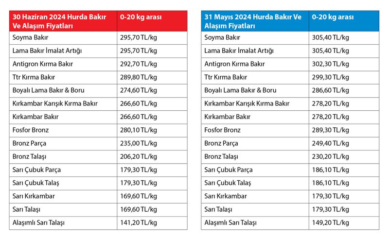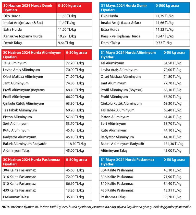 Nisana ayında ise yüzde 5 ila 30 arasında bir yükseliş kaydetmişti. Haziran ayında ise bazı hurda çeşitlerinde yüzde 1 ila 5 düşüş yaşanırken hurda paslanmaz fiyatlarında ise kısmi bir artış yaşandı.