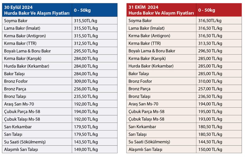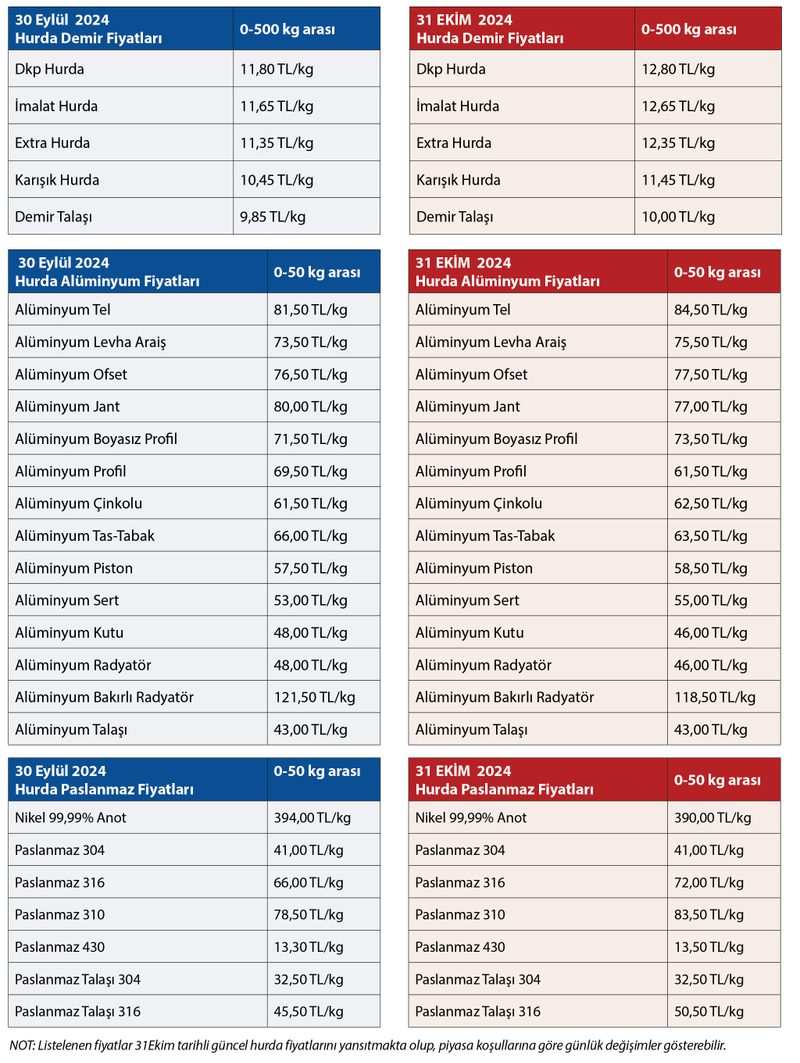 Son dönemde dünya genelinde emtia fiyatlarında yaşanan artışla birlikte hurda bakır fiyatlarında eylül ayında yaklaşık yüzde 7 ila 10 arası artış kaydetmişti. Ekim ayı sonunda ise hurda bakır ve diğer metal hurda çeşitlerinde fiyatlar stabile yakın seyrediyor.
