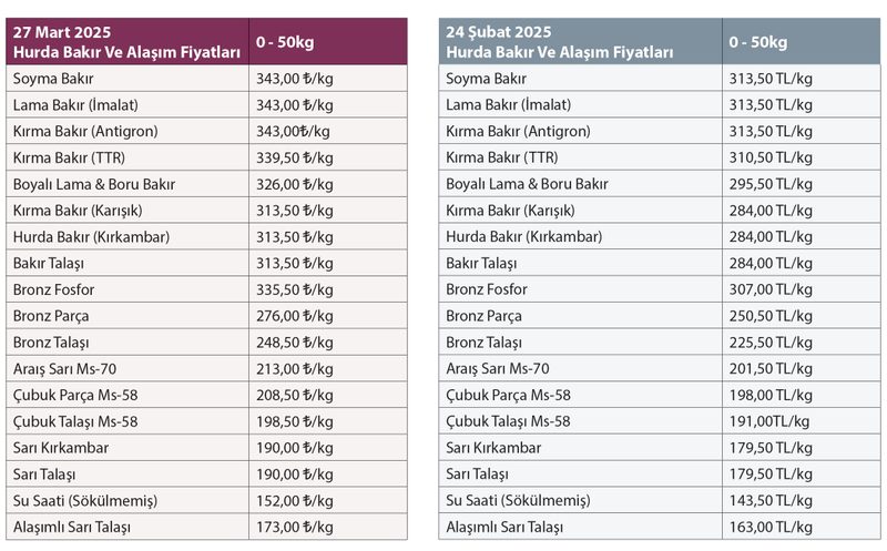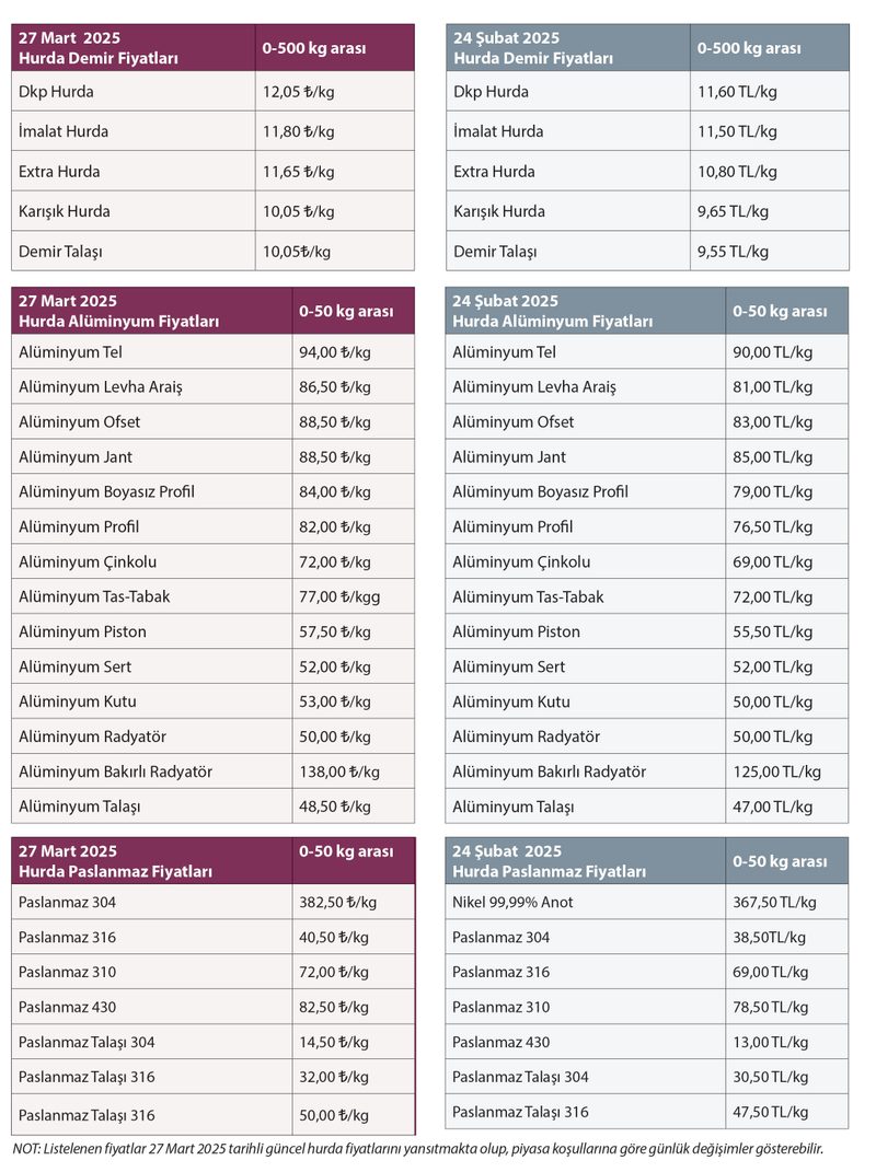 Bakır ve alaşım fiyatları 2025 Ocak-şubat ayında yaklaşık yüzde 5 artarken mart ayında bu yükseliş yaklaşık yüzde 15 ila 20’lere çıktı. Hurda alüminyumda da ocak-şubat ayında yüzde 4 bir artış gözlemlenirken mart ayında ise yüzde 10’luk bir artış söz konusu. Bunun yanı sıra hurda demirde ve hurda paslanmazda da hızlı bir yükseliş gözlemlendi.