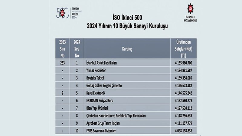 Üretimden satışlar baz alınarak yapılan 2024 yılı İSO İkinci 500 sıralamasına göre İstanbul Asfalt Fabrikaları 4 milyar 186 milyon TL ile ilk sırayı aldı. Onu 4 milyar 185 milyon TL ile Yılmaz Redüktör takip ederken Boyteks Tekstil 4 milyar 169 milyon TL ile üçüncü oldu.