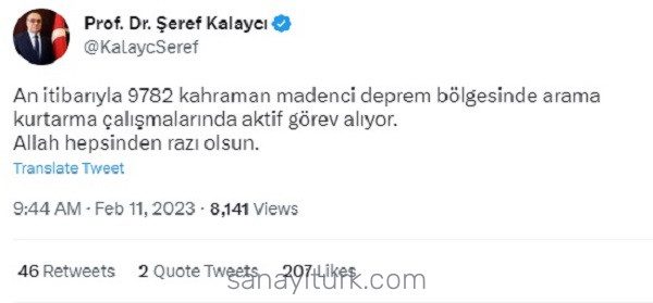 Enerji ve Tabii Kaynaklar Bakan Yardımcısı Prof. Dr. Şeref Kalaycı ise “An itibarıyla 9782 kahraman madenci deprem bölgesinde arama kurtarma çalışmalarında aktif görev alıyor. Allah hepsinden razı olsun.” şeklinde bilgi verdi.