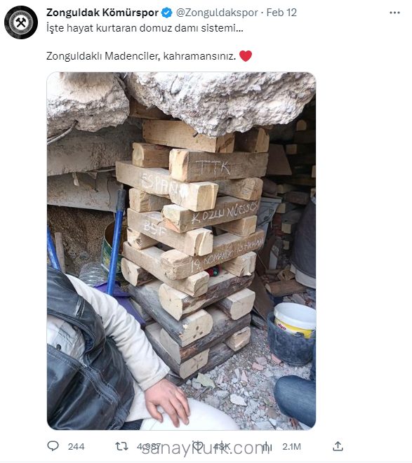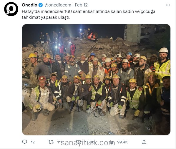 Zonguldaklı madencilerimiz, Adıyaman’da 8 metre derinliğe inerek 17 yaşındaki Gülsüm Yeşilkaya’nın hayatını kurtarırken, Hatay’da depremin yıktığı enkazda çalışan madenciler 88 saat sonra 10 saatlik bir çalışma sonrasında İbrahim Halil ve Ayla Halil çiftini enkaz altından sağ çıkarmayı başardı. Adıyaman’da 7 yaşındaki Solin de madenciler sayesinde hayata tutunan bir başka depremzede oldu. Somalı madenciler, Samandağ’da enkazdan 15 vatandaşımızı sağ olarak çıkardı. Madencilerimiz 11 yaşındaki Lena ve annesini 10 saatlik çalışmayla depremden 160 saat sonra enkazdan çıkarırken Gaziantep'te madencilerimiz 6 günün sonunda İkranur'a ulaştı. Hatay’da madencilerimiz 110 saat sonra bir anne ve bebeğini enkazdan kurtardı. Adıyaman'da 152’inci saatin sonunda arama kurtarma ve madenciler biri kadın, biri çocuk, iki kardeşi sağ olarak çıkardı. Elbistan’da 4 kişi sağ olarak Somalı madenciler tarafından kurtarıldı, Rize’den katılan madenciler Kahramanmaraş’ta biri bebek 11 kişiyi kurtardı. İzmirli madenciler, 107 ve 127 saat boyunca enkaz altında kalan iki kişiyi kurtararak, bir mucizeyi gerçekleştirmiş oldu. Bu örnekler sadece birkaçı…