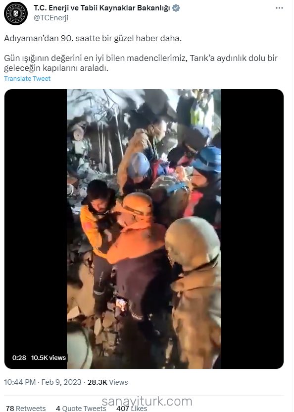 T.C. Enerji ve Tabii Kaynaklar Bakanlığı 9 Şubat’ta “Adıyaman’dan 90. saatte bir güzel haber daha. Gün ışığının değerini en iyi bilen madencilerimiz, Tarık’a aydınlık dolu bir geleceğin kapılarını araladı.” şeklinde paylaşım yaparken,