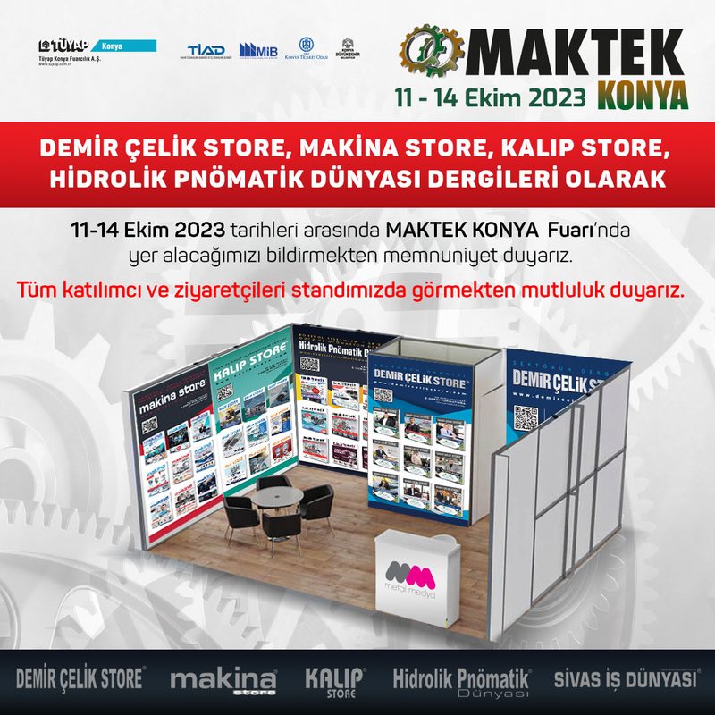 Metal Medya Grubu olarak bizde DEMİR ÇELİK STORE, MAKİNA STORE, KALIP STORE VE HİDROLİK PNÖMATİK DÜNYASI dergilerimizle MAKTEK KONYA FUARI'nda siz değerli okuyucularımızla buluşmaktan mutluluk duyarız.