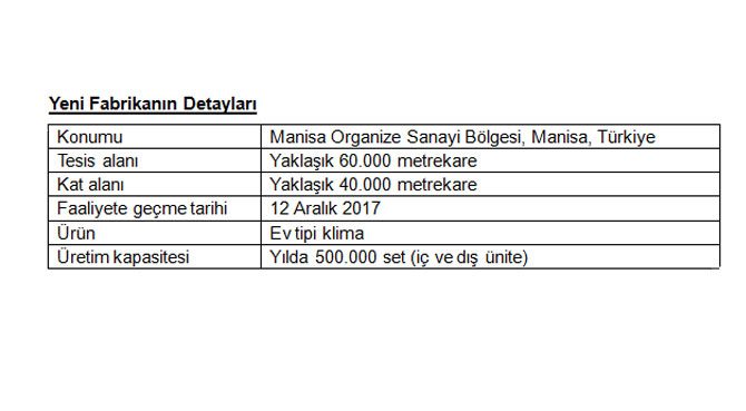 Mitsubishi Electric, ev tipi klima talebinde artış beklenen Türkiye ve Avrupa’da iş hacmini büyütmeyi amaçlıyor. Mart 2021’de sona eren mali yıl itibari ile yıllık üretim miktarının 500.000 sete (iç ve dış ünite) ulaşması hedefleniyor. Yeni Fabrikanın Hedefleri Mitsubishi Electric’in Avrupa’daki klima ve soğutma sistemleri faaliyetleri her geçen gün büyüyor ve Türkiye’deki talebin de ülkenin ekonomik büyümesine ve nüfus artışına paralel olarak artması bekleniyor. Yeni fabrikanın, Türkiye’de ve Avrupa’daki talep dalgalanmalarına yanıt veren ve ayrıca yerel pazarlara yönelik özel tercihleri ve çevresel gereklilikleri karşılayan esnek bir tedarik zinciri sağlamak üzere lokalizasyon çalışmalarının hızlandırılmasında kilit rol oynaması bekleniyor.