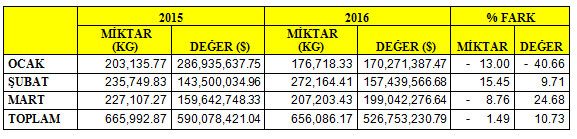Mücevher İhracatçıları Birliği tarafından açıklanan 2016 Mart ayı verilerine göre 2015 Mart ayında 227 bin 107 kilo ürün ihraç eden sektör 2016 Mart ayında yüzde 8,76 düşüşle 207 bin 203 kilo ihracat gerçekleştirdi.