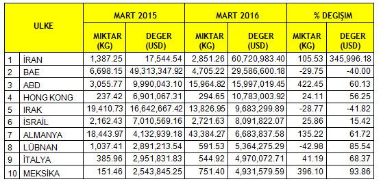 2016 yılına ihracattaki genel düşüşe uygun hareket eden mücevher sektörü ihracatı, Mart ayında ciddi bir yükseliş göstererek ilk çeyrekte yüzde 10,73 arttı. 2015 Mart ayına göre yüzde 24,7, 2016, Şubat ayına göre de yüzde 26,4 artış gösteren ihracatı değerlendiren Mücevher İhracatçıları Birliği Başkanı Ayhan Güner, “Yükselişin geleceğini öngörmüştük. Eğer sürpriz gelişmeler olmazsa artış trendinin yükselmesini bekliyoruz.” dedi. İran’a ihracat yüzde 395 bin gibi rekor bir artışa imza attı.