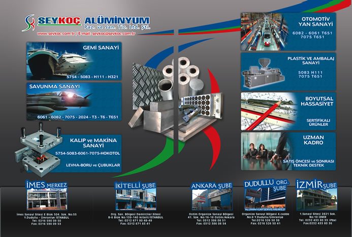 “Konusunda uzman ve mühendis deneyimli kadrosuyla Seykoç Alüminyum; makina, kalıp, tekstil, denizcilik, gıda, otomotiv ve savunma sektörlerindeki geniş yelpazedeki müşterilerine gereksinim duydukları 2xxx, 5xxx, 6xxx ve 7xxx serisi alaşımlarda yalnız ürün satarak değil her türlü bilgi desteğiyle de hizmet sunmaktadır. Ürün portföyü olarak alışılmışın dışında tedarik boyutunda ciddi sıkıntılar yaşanan malzemeleri seçiyoruz. Malzeme portföyümüzün çok geniş olmasından dolayı çok fazla ülke ve üretici ile çalışıyoruz. Özellikle Türkiye’ de teknoloji eksikliğinden üretilemeyen alüminyum alaşımları dünya standartlarında olmak koşuluyla, Almanya, Belçika, Norveç, Romanya, Mısır ve Rusya’ da ürettirilerek stoklarımızdan tüketiciye en uygun koşullarda sunulmaktadır.”