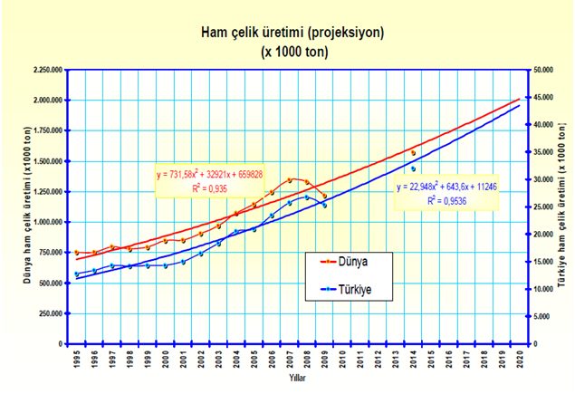 2009 yılında dünya ham çelik üretimi 8 daralarak 1,2 milyar ton seviyesinde gerçekleşmiştir. 2009 yılında dünya ham çelik üretiminin 47’sini gerçekleştiren Çin’in yıllık üretim artışı ise 13,5 düzeyindedir. 2009 yılında Çin’in üretiminde yaşanan artışlar dünya genelindeki daralmayı frenlemiştir. Zira, Çin harici dünya ham çelik üretimindeki daralma 21 seviyelerindedir. 2009 yılında Türkiye toplam üretim düzeyi; 25,3 milyon ton düzeyinde gerçekleşirken, bir önceki yıla göre 5,6 düzeyinde bir daralma yaşanmasına rağmen, Çin harici Dünya genelinde yaşanan 21’likdaralma göz önünde bulundurulduğunda, Türkiye’nin bu dönemde, genel daralmanın gerisinde kaldığı görülmektedir. Bir yıl önce yapılan tahminlere göre; Tüm etkenler göz önüne alındığında, Dünya çapında reel çelik tüketiminin; 2010 yılında, 0,3, 2011 yılında ise, 4,5 oranında artmasının beklendiği belirtilmekte idi.