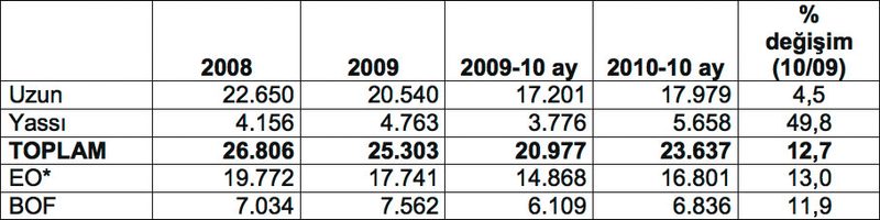 2010 yılının Ocak-Ekim döneminde, Türkiye’nin ham çelik üretimi 12.7 oranında artışla, 20.98 milyon tondan, 23.64 milyon tona yükseldi. Uzun ürünlere yönelik ham çelik üretimi 4.5 oranında artışla, 17.2 milyon tondan, 17.98 milyon tona yükselirken, yassı ürünlere yönelik ham çelik üretimi 49.8 oranında artışla, 3.77 milyon tondan, 5.66 milyon tona ulaştı. Geçtiğimiz yılın aynı dönemine kıyasla, yassı ürünlerin toplam ham çelik üretimi içerisindeki payı, 18’den 23.9’a ulaşırken, uzun ürünlerin payı ise, 82’den 76’ya geriledi.