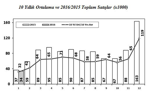 • 2016 yılı Ocak ayında toplam satışlar 34 bin adet seviyesinde gerçekleşti ve toplam pazar 2015 yılı aynı ayına göre yüzde 8 oranında azaldı.