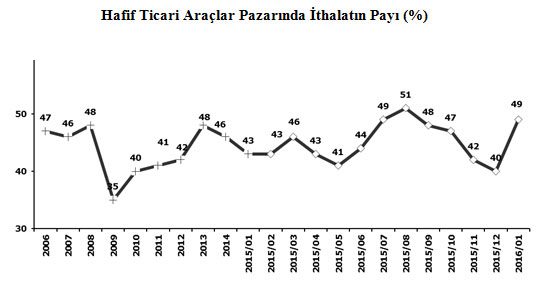 2006–2016 yılları Ocak aylarına ait hafif ticari araç (minibüs+kamyonet) satışları aşağıdaki tabloda belirtilmiştir. Buna göre, ithalatın pazar payının 2016 yılı Ocak ayında yüzde 49 olarak gerçekleştiği görülmektedir.