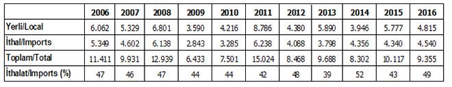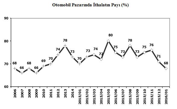 2006–2016 yılları Ocak aylarınaait otomobil satışlarıaşağıdaki tabloda belirtilmiştir. Buna göre, ithalatın pazar payının 2016yılı Ocak ayındayüzde 68 olarak gerçekleştiği görülmektedir.