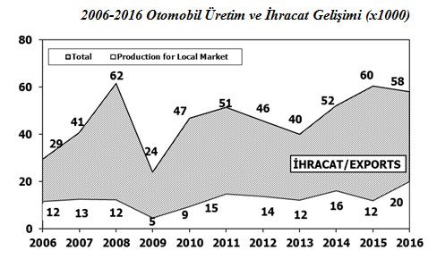 2016 yılı Ocak ayında bir önceki yılın aynı ayına göre, toplam üretim yüzde 5, otomobil üretimi ise yüzde 4 oranında azaldı. Bu dönemde, toplam üretim 98 bin adet, otomobil üretimi ise 58 bin adet düzeyinde gerçekleşti.