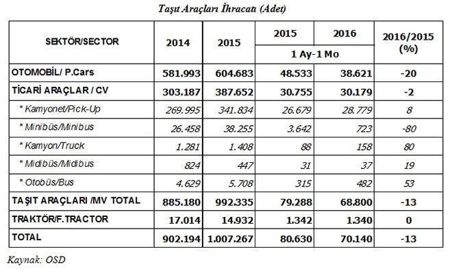 2016 yılı Ocak ayında bir önceki yılın aynı ayına göre, toplam otomotiv ihracatı adet bazında yüzde 13 oranında azalırken otomobil ihracatı ise yüzde 20oranında azaldı. Bu dönemde, toplam ihracat69 bin adet, otomobil ihracatı ise 39 bin adet düzeyinde gerçekleşti.