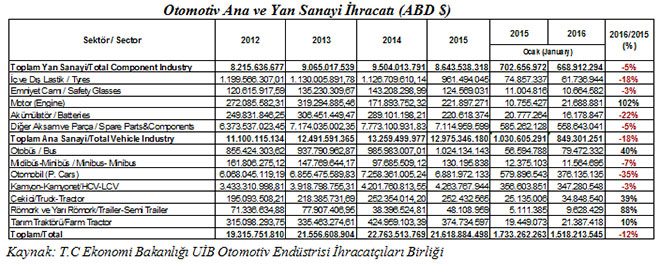 T.C Ekonomi Bakanlığı Otomotiv Endüstrisi İhracatçılar Birliği verilerine göre, 2016 yılı Ocak ayında toplam ihracat, Euro-ABD Doları paritesi nedeni ile 2015 yılı aynı ayına göre değer bazında yüzde 12oranında azaldı ve 1,518 milyar $ oldu. Euro bazında ise yüzde 6 azalarak 1,394 milyar Euro olarak gerçekleşti.
