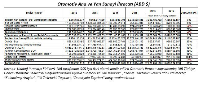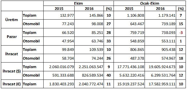 2016 yılı Ocak-Ekim döneminde bir önceki yılın aynı dönemine göre, toplam otomotiv ihracatı Dolar ve Euro bazında yüzde 10 arttı. Bu dönemde toplam otomotiv ihracatı 19,6 Milyar $ olarak gerçekleşirken, otomobil ihracatı yüzde 12 artarak 6,3 Milyar $ seviyesinde gerçekleşti.