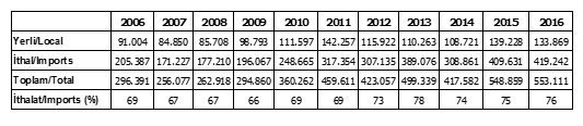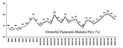 - Otomobil pazarında ithalatın pazar payı 2016 yılı Ekim ayında yüzde 76 düzeyinde gerçekleşti.