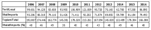 • 2006–2016 yılları Ocak-Ekim dönemine ait otomobil satışları aşağıdaki tabloda belirtilmiştir. Buna göre, ithalatın pazar payının 2016 yılı ilk on ayında yüzde 76 olarak gerçekleştiği görülmektedir.