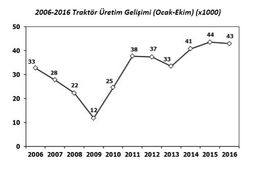 • 2016 yılı Ocak-Ekim döneminde traktör üretimi yüzde 1 oranında azalarak 42 bin 947 adet oldu.